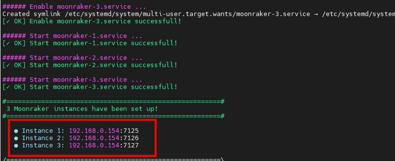 The completion of the installation is like this, it is best to remember the address framed in red. This will be the address for Moonraker to add the printer, usually 7125 7126 7127