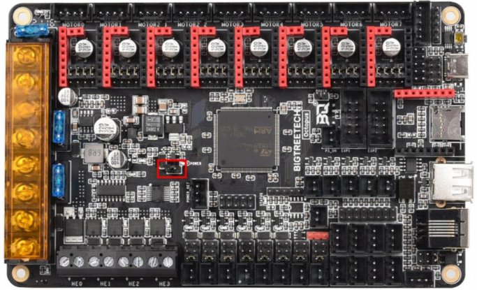 The Octopus can be powered using the USB-C port by inserting the jumper as shown below. This can make it easier to compile and download firmware directly to the motherboard using DFU mode.
