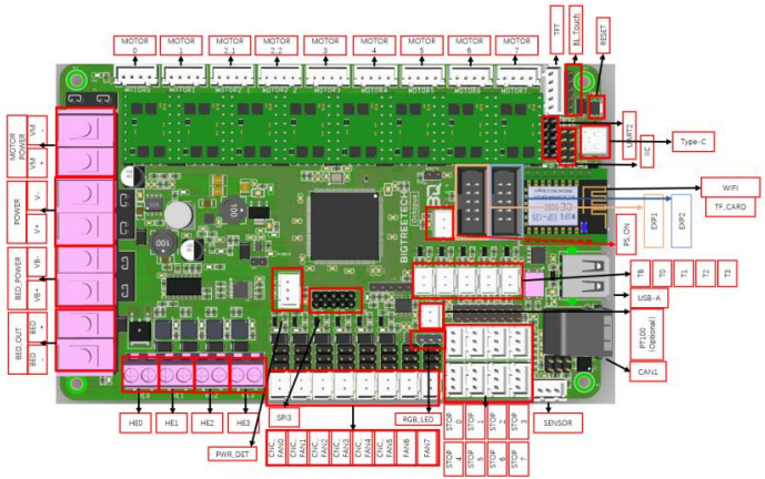 - Includes inputs for up to 6 endstop switches and 2 filament runout interfaces.