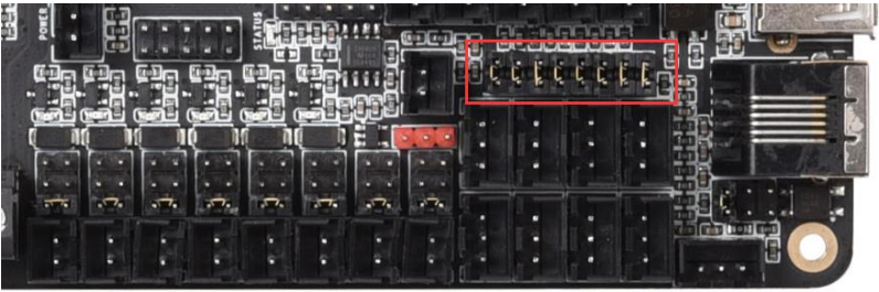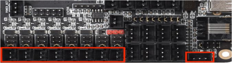 The Octopus features 6 PWM fan outputs and two “always on” fan outputs. There is also a dedicated pin header for a proximity sensor. These headers are shown in the image below.