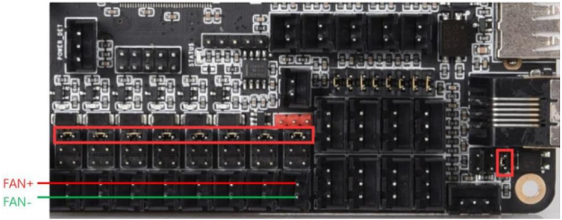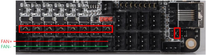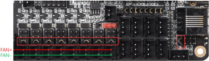 Note: The polarity of the fan ports was erroneously swapped on the silkscreen on the underside of some early boards. To be sure of the correct polarity, please consult the PINS.pdf document or see the images below.