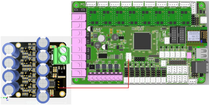 When using the BIGTREETECH mini UPS, wire it to the motherboard as shown in the figure below. As always, never perform any work on the motherboard with power applied.