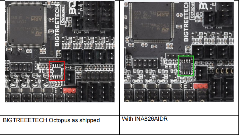 - The stock Octopus does not come with a INA826AIDR amplifier chip. If you want to use the PT100 interface, you need to purchase a INA826AIDR chip (SOP-8 Package) separately and solder the chip into the correct position as shown below.