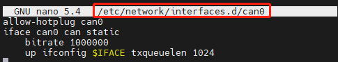 Execute sudo nano /etc/network/interfaces.d/can0 in the SSH terminal to edit the can0 file and check if the contents of the file are correct. The bitrate 1000000 represents the baud rate of the CAN bus and should be consistent with the settings in Klipper.