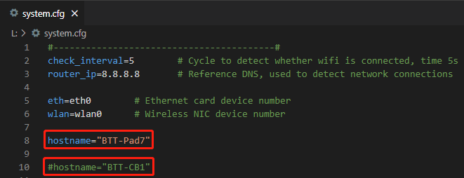 hostname="BTT-Pad7" - This line is recognized by the system, and the hostname is set to "BTT-Pad7".