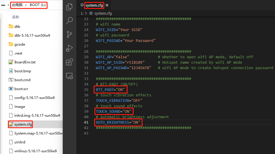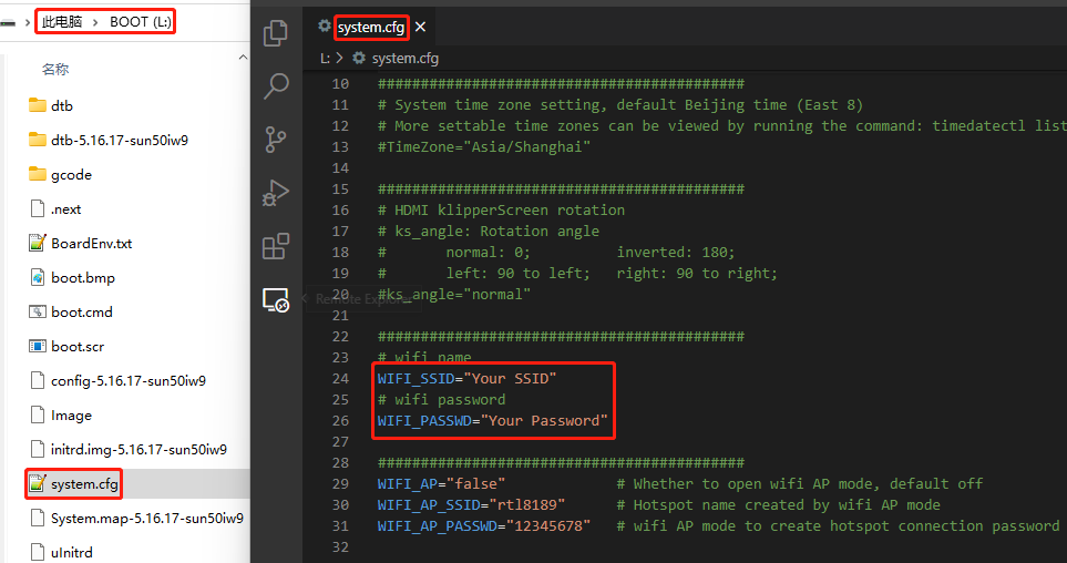 After the OS image has been burned onto the microSD card, a FAT32 partition that is recognized by the computer will be created on the card. Under this partition, there will be a configuration file named "system.cfg". Open this file, and replace WIFI-SSID with the actual name of your WIFI network, and PASSWORD with your actual WIFI password.