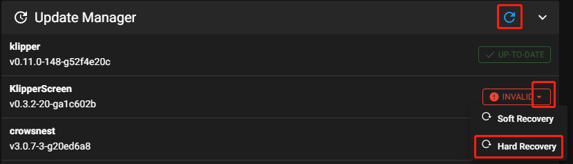 3.Click the refresh button in the upper right corner of the Update Manager, then Hard Recovery KlipperScreen.