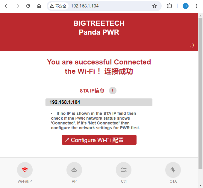 4 Press the 'Connect' button. Following this, you will be automatically redirected to the control (ctl) page where you can find the updated IP address on the 'Wi-Fi & IP' page.