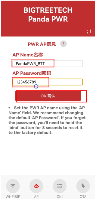 - Navigate to the AP page by clicking the "AP" button, where you can modify the AP name and password. Confirm changes by clicking the "OK" button.