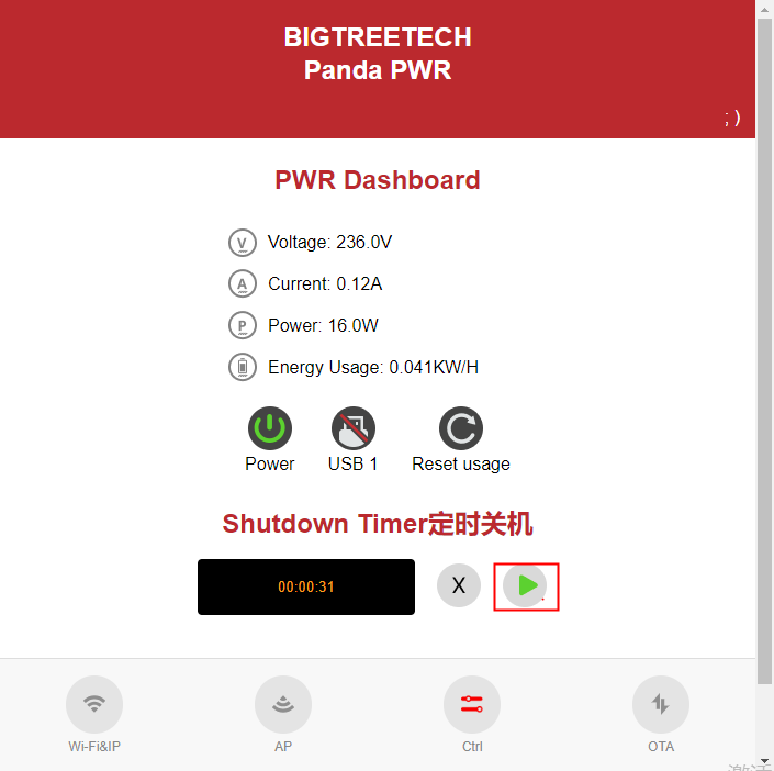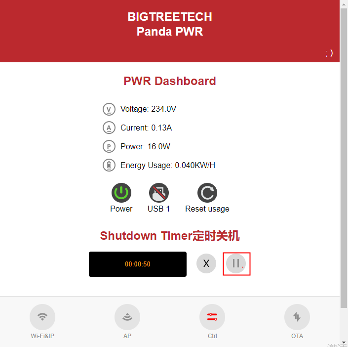 The Panda PWR records the power consumption of the load. To reset the data, click the "RST Usage" button.