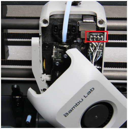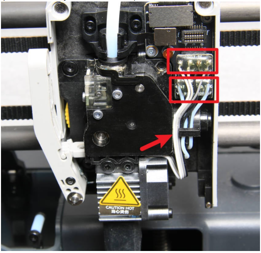 Disconnect the hotend fan and the heater connectors from the board, and remove the wires by sliding them out of the clip shown in the image below (indicated by a red arrow).