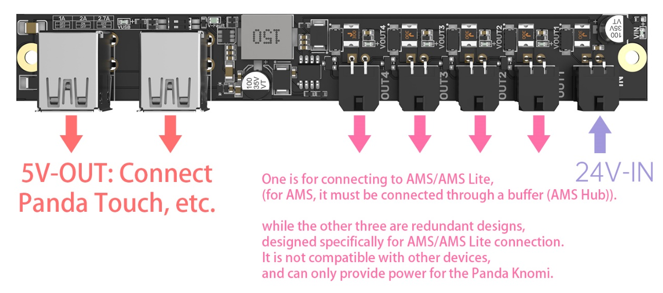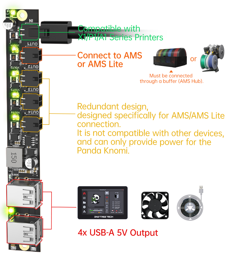 The BIGTREETECH Panda Branch V1.0 is a power expansion board designed for X1/P1/A1 series printers. It features four 5V outputs, which can be used to power devices such as the Panda Touch, USB fans, and USB light strips. Additionally, it includes the MX3.0 2x2 Pin interface for powering the AMS/AMS Lite.