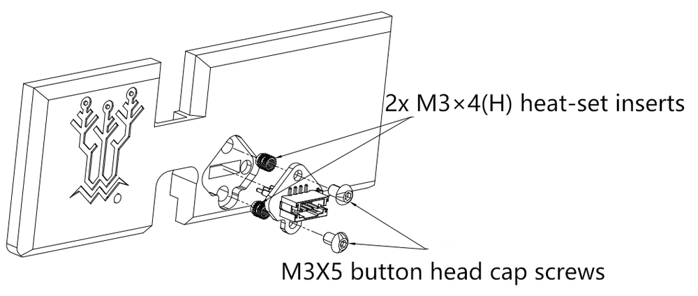 2.Then use the soldering iron to insert two additional heat-set inserts into the printed mounting bracket and secure the Panda Sense Dock using M3X5 button head cap screws.