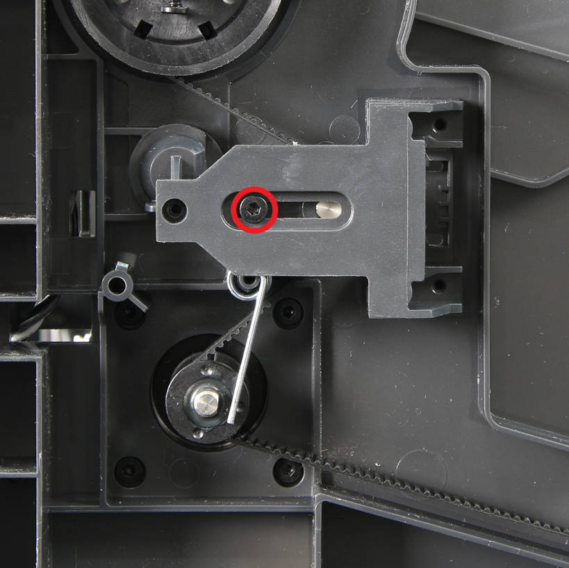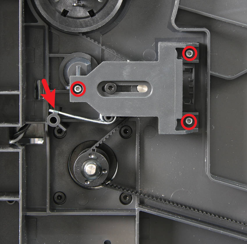 Remove the tensioner cover and the tensioner: Use an H1.5 hex key to remove the 3 screws securing the tensioner cover. Use an H2.0 hex key to unscrew the tensioner screw and remove the Z tensioner cover, spring, and tensioner.