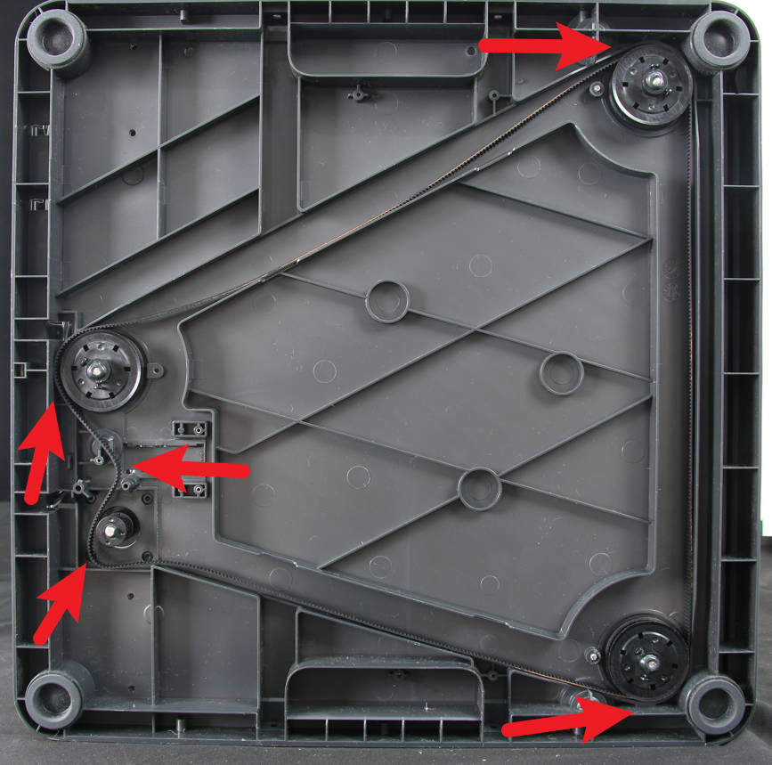 Install the new Z timing belt: Place the new Z timing belt at the bottom of the printer, ensuring it is positioned as shown in the figure. Make sure the toothed side faces inward.