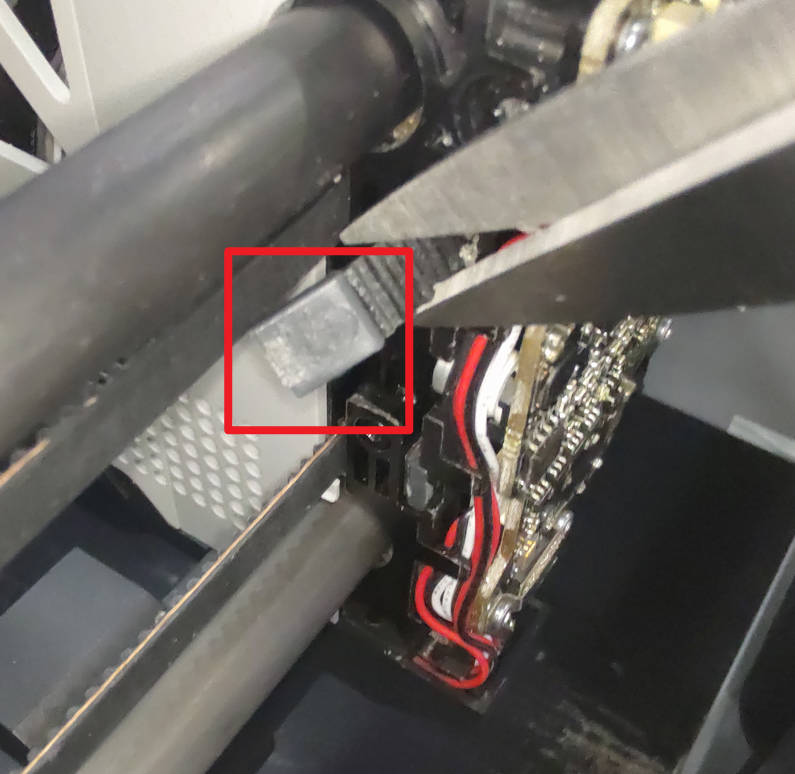 Note: If the belt is still intact, hold it with your fingers and push it toward the fixing block to make it easier to pry off the fixing block.