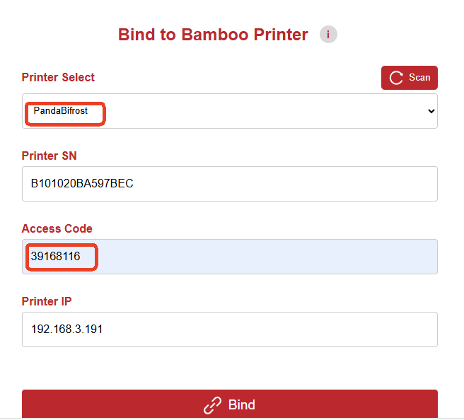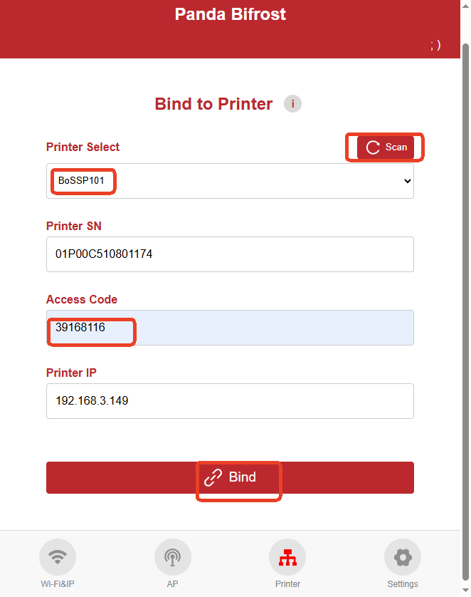 Once a printer is bound, the device will broadcast its information over the local network, simulating a printer named "PandaBifrost".