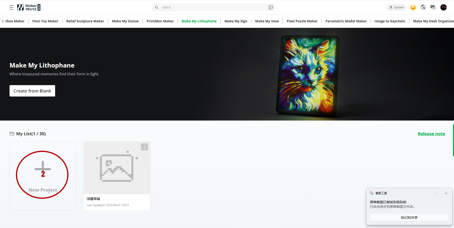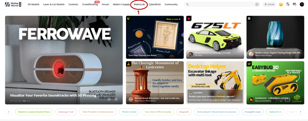 Open Bambu Studio/Maker World (using MakerWorld as an example), go to the homepage and click on MakerLab to select the Lithophane Generator.