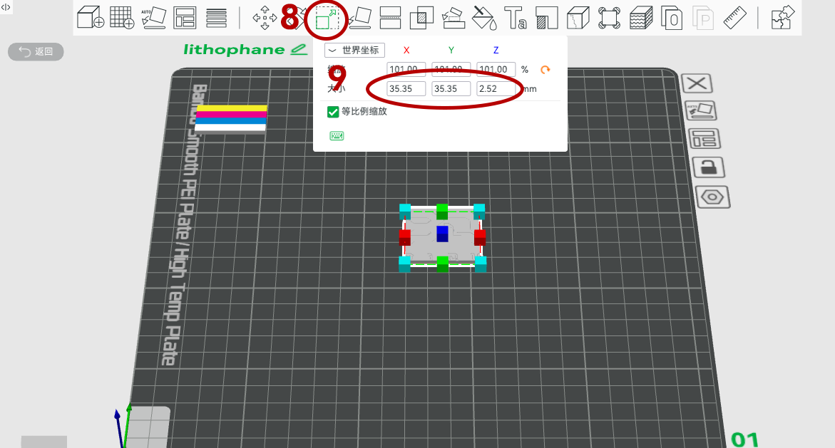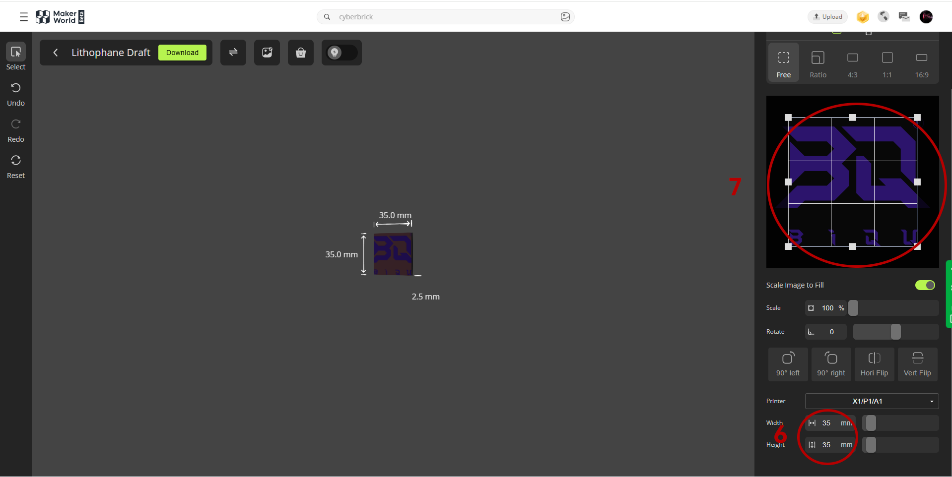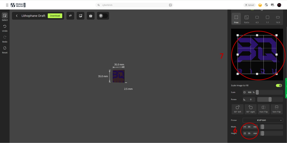 Click "Export to Bambu Studio," then select the size options and set the width and height to 35.35mm.