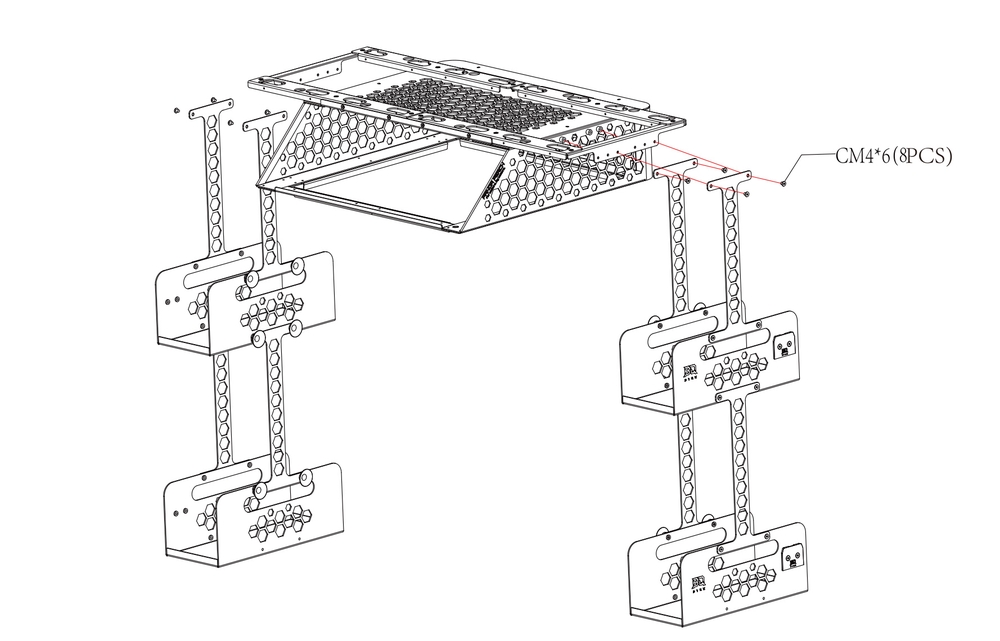 Secure the top panel to the main frame using CM3x4 screws, ensuring the raised side is facing upward.