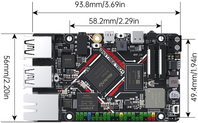 BIGTREETECH Pi 2 uses the higher performance quad-core A55-RK3566 chipset. It consists of rich interface functions, a built-in eMMC5.1, onboard support for 2.4G/5G dual-mode, and WiFi transmission speeds of up to 433.3Mbps. It also supports the Bluetooth BT5.2 version. It has the same mounting hole positions as the Raspberry Pi; therefore, installation and use are convenient and quick.