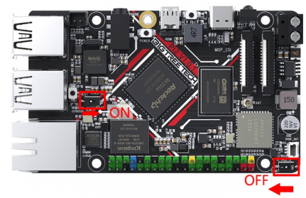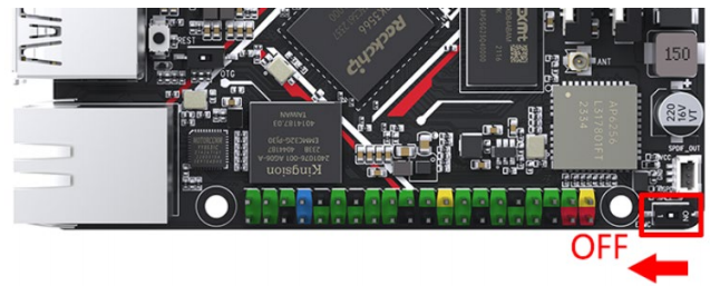 As shown in the figure, toggle the eMMC switch to the OFF position so that the RK3566 can access the eMMC normally.