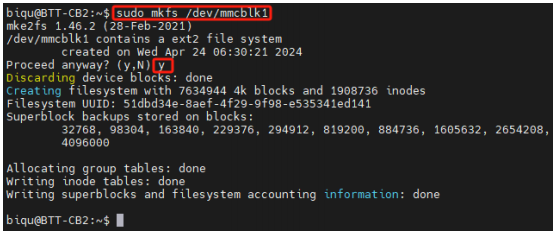 2、Run the command sudo mkfs /dev/mmcblk1 and then enter "y" to confirm.