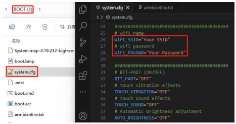 After the system image has been written, the MicroSD card will have a FAT32 partition recognized by the computer. In this partition, there is a "system.cfg" file. Open it and replace "Your SSID" with your actual WiFi name and "YourPassword" with the actual password.