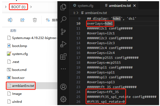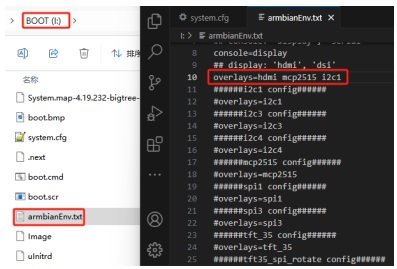 Open the "armbianEnv.txt" file in the BOOT partition and set the values for overlays. The configuration file supports only one line of overlays at a time; if multiple overlays are enabled, only the last line will take effect. If you need multiple overlays, place the contents of multiple configurations on the same line separated by a space. For example, if you need to use a DSI screen, MCP2515 SPI to CAN module, and I2C1 simultaneously: