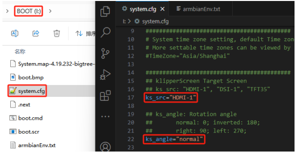 3、To configure KlipperScreen, open the system.cfg file in the BOOT partition. Set the screen type with the parameter ks_src, and the rotation angle with ks_angle.