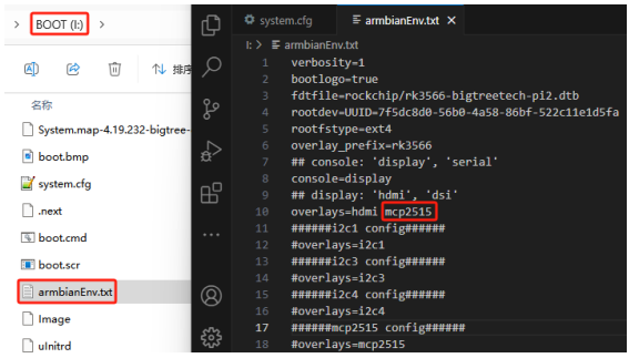 Open the "armbianEnv.txt" file in the BOOT partition and add "mcp2515" to the overlays configuration.