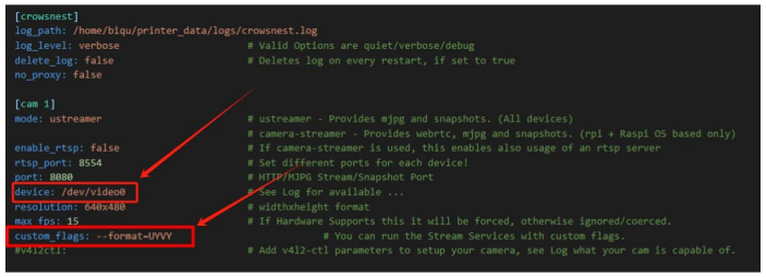 For both RPi v1.3 ov5647 and RPi v2 imx219 cameras, no specific configuration in "armbianEnv.txt" is required as they are plug-and-play. "crowsnest.conf" file configuration is as follows: