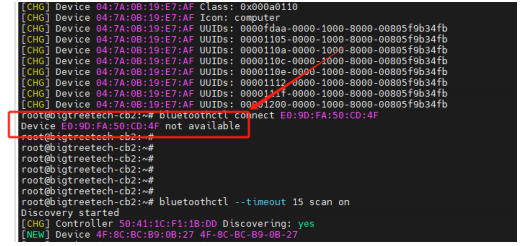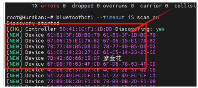 1、 To scan for Bluetooth devices, enter the following command, and a list of Bluetooth devices will appear as shown below: