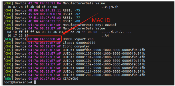 2、Find your Bluetooth device, for example, if your device name is "HONOR xSport PRO", locate the corresponding Bluetooth MAC ID as shown below.
