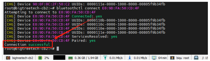 3、To connect to a Bluetooth device, enter the following command, connection success is shown as below