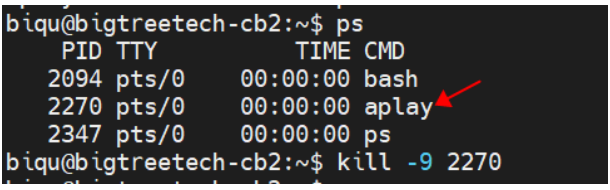 4、If you exit voice playback during the use of Bluetooth and cannot reuse it, manually delete the corresponding playback process. Use the ps command to view the process number, then use kill -9 process_number to delete the corresponding playback process.