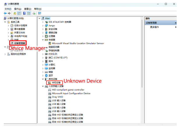 ① In “Device Manager”, if you see “Unknown Device”, it indicates that the computer is missing drivers.