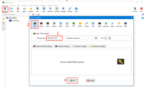 5、Open Mobaxterm and click "Session", and click "SSH", inset the device IP into Remote host and click "OK" (Note: your computer and the device needs to be in the same network).