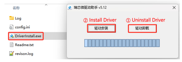 ② Open the DriverAssistant tool in the downloaded RKDevTool folder, click “① Uninstall Driver”, then click “② Install Driver” to ensure that the latest version of the driver is installed.