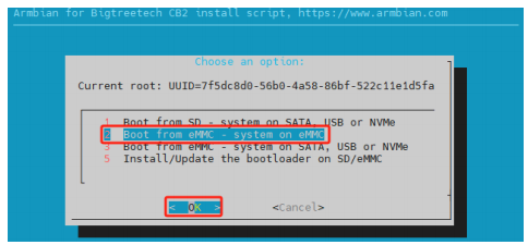 Execute the command sudo nand-sata-install. In the interface that pops up, select "2 Boot From eMMC - system on eMMC" and then select "OK"