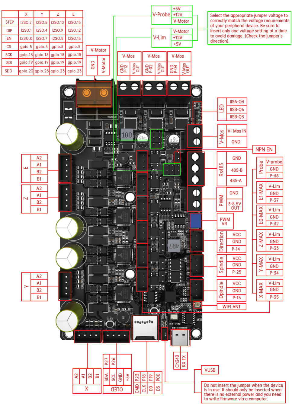 - V-MOS Power Input: Accepts DC12V to DC36V with three externally controllable voltage output ports, supporting up to 5A; output voltage depends on the V-MOS input.