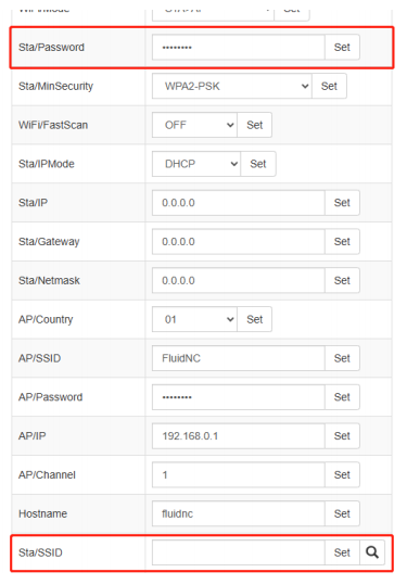 3、Modify Sta/SSID (Wi-Fi name) and Sta/Password (Wi-Fi password), then click "Set" to apply changes.