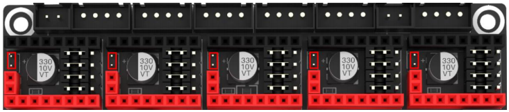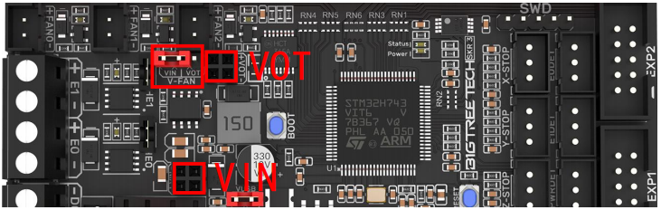 Connect jumper between the two pins of VIN if using DCIN as CNC fan voltage. Connect jumper between the two pins of VOT and insert SKR 3-DC MODE on to the 2*4 Pin sockets if 12V or 5V is desired *