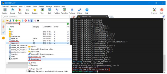 3、Run make to compile firmware,“klipper.bin”file will be generated in home/pi/kliiper/out folder when make is finished, download it onto your computer using the ssh application.
