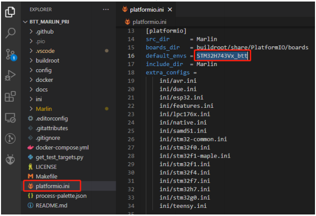 Open platformio.ini file and change default_envs to STM32H743Vx_btt