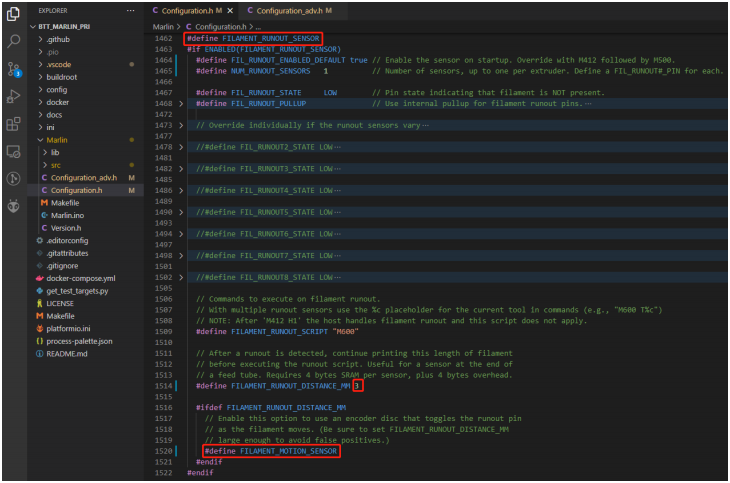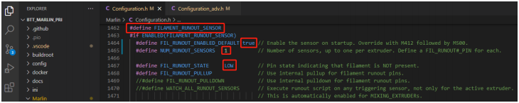 #define FILAMENT_RUNOUT_SENSOR // enable filament run out sensor #define FIL_RUNOUT_ENABLED_DEFAULT true // true default to filament run out sensor enanbled #define NUM_RUNOUT_SENSORS 1 // number of filament run out sensor #define FIL_RUNOUT_STATE LOW // voltage level of the filament runout sensor trigger signal.