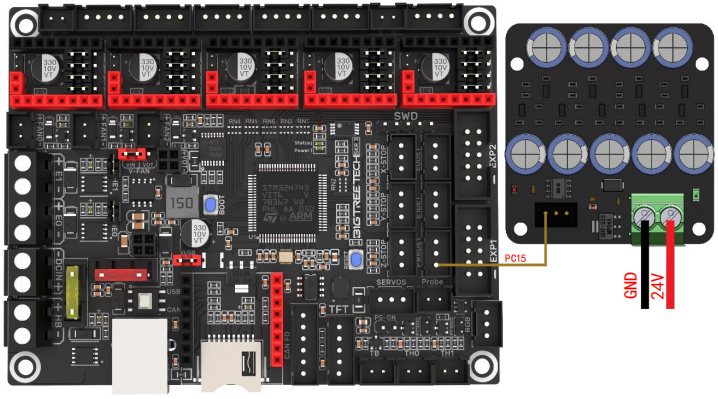 2、external UPS 24V V1.0 module,when power is cut, the module will provide power to the board and signal the board to save current print status to SD card. This method has virtually no effect on the life of the SD card.