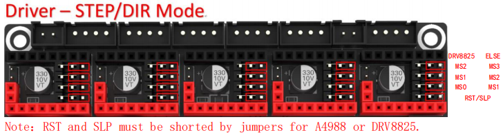 i.e:A4988、DRV8825、LV8729、ST820 etc,connect jumpers(MS0-MS2) according to the microstep chart
