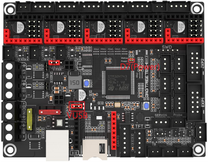 After the SKR 3 board has been powered,the Red led D7(Power) to the upper right of the MCU will light up, indicating power on. When using only USB to power the boar, Please insert the jumper cap onto the VUSB jumper.