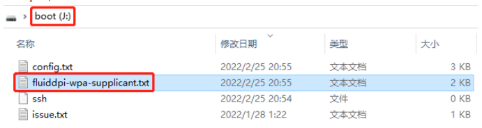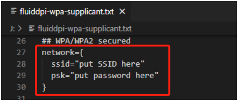 2、Find“fluiddpi-wpa-supplicant.txt”or “mainsail-wpa-supplicant.txt”in the SD card root directory, open it with VSCode (do not open it with windows notepad)